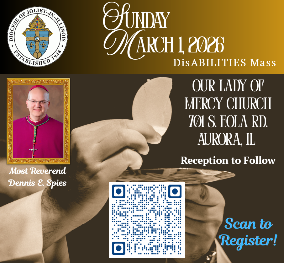 Please join Bishop Spies in a special Mass for persons with disabilities and their families. Register using the form below by Tuesday, February 24, 2026. The Mass for Persons with Disabilities will be held at Our Lady of Mercy, Aurora, IL at 2:00pm on Sunday, March 1, 2026. Refreshments and fellowship to follow. Please contact us with any special accommodation requests.