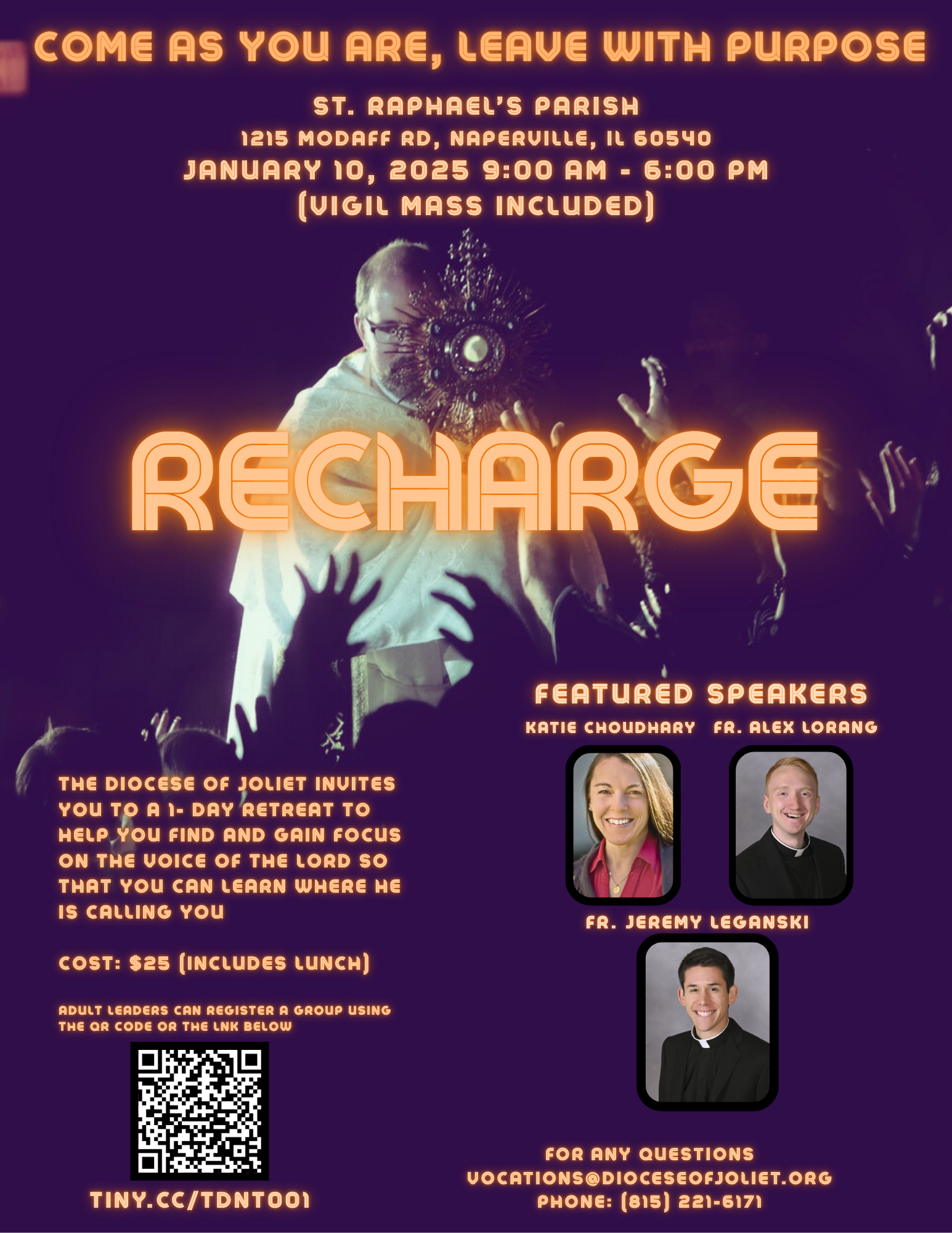 The Diocese of Joliet invites you to a 1-day retreat to help you find and gain focus on the voice of the Lord so that you can learn where He is calling you. Teens may register with their parish for this event. Any questions? Contact 815-221-6171 or [email protected]. This event will take place at St. Raphael Catholic Church in Naperville.
