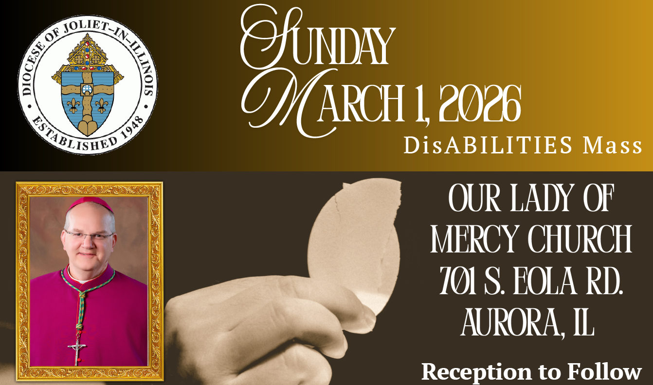Please join Bishop Spies in a special Mass for persons with disabilities and their families. Register using the form below by Tuesday, February 24, 2026. The Mass for Persons with Disabilities will be held at Our Lady of Mercy, Aurora, IL at 2:00pm on Sunday, March 1, 2026.